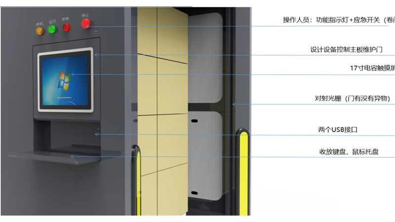 22工控觸摸顯示屏,配備可收放鍵盤,方便實(shí)時(shí)交互輸入操作。工控顯示屏鑰匙開(kāi)啟后可上掀,方便維護(hù)。